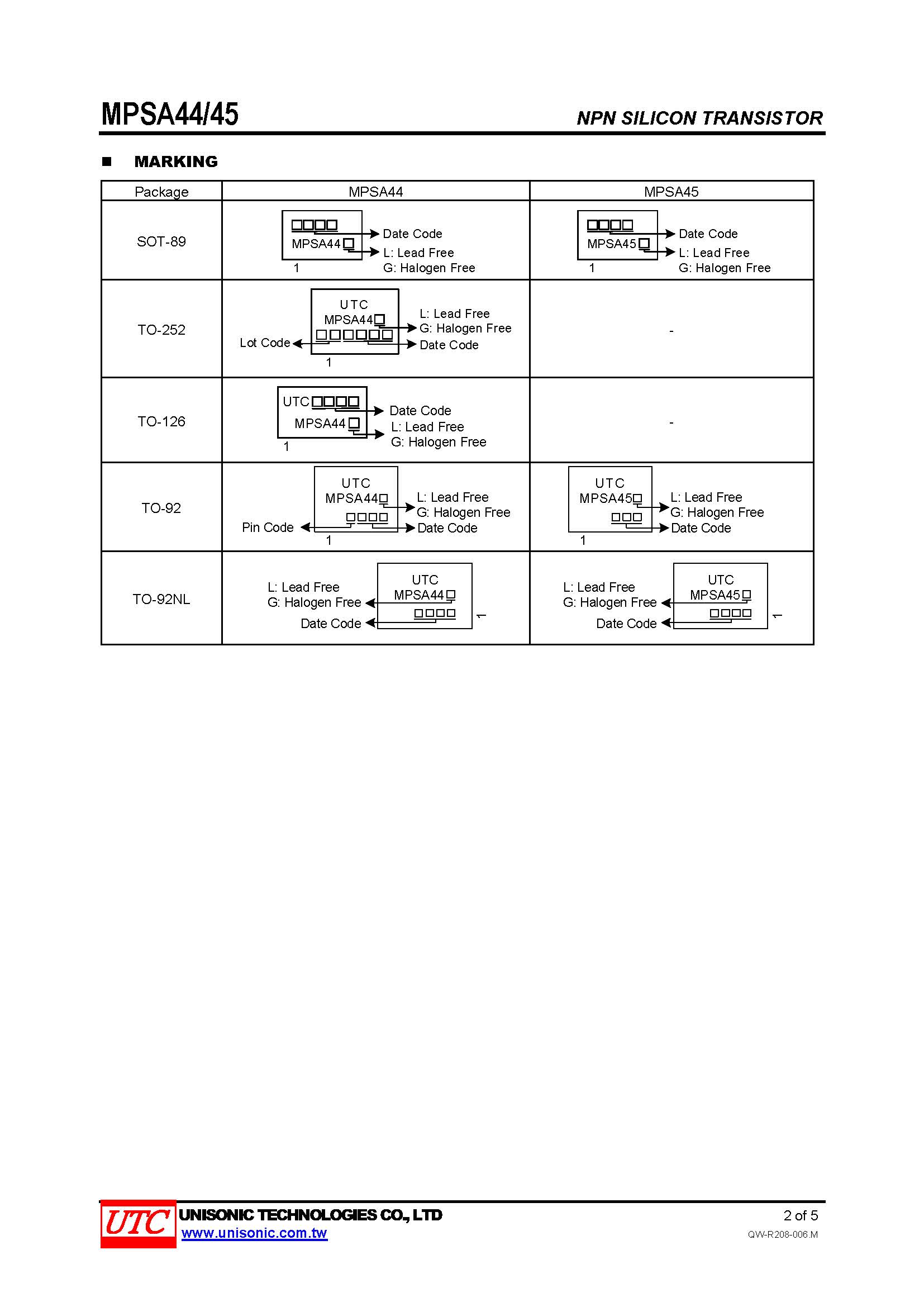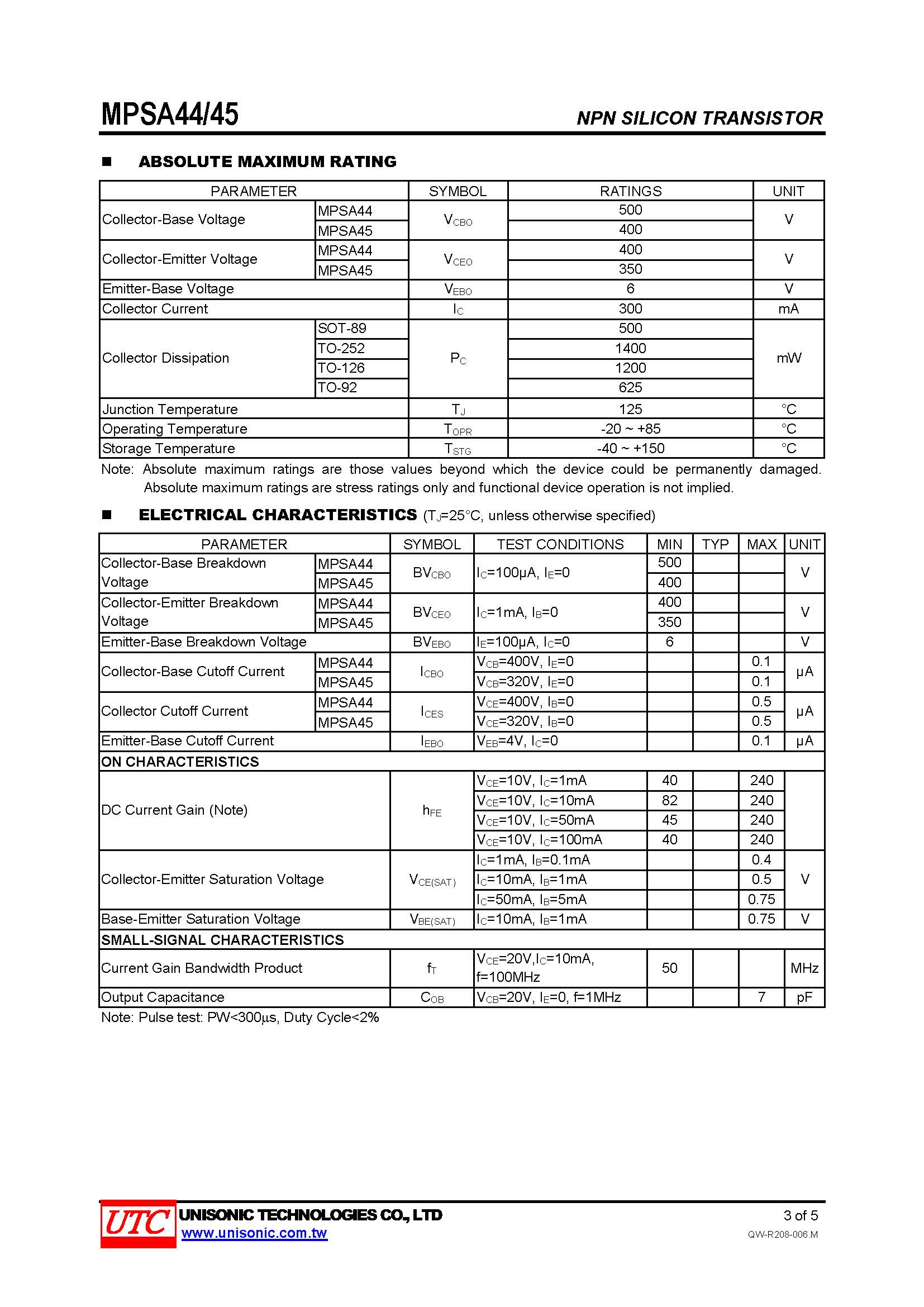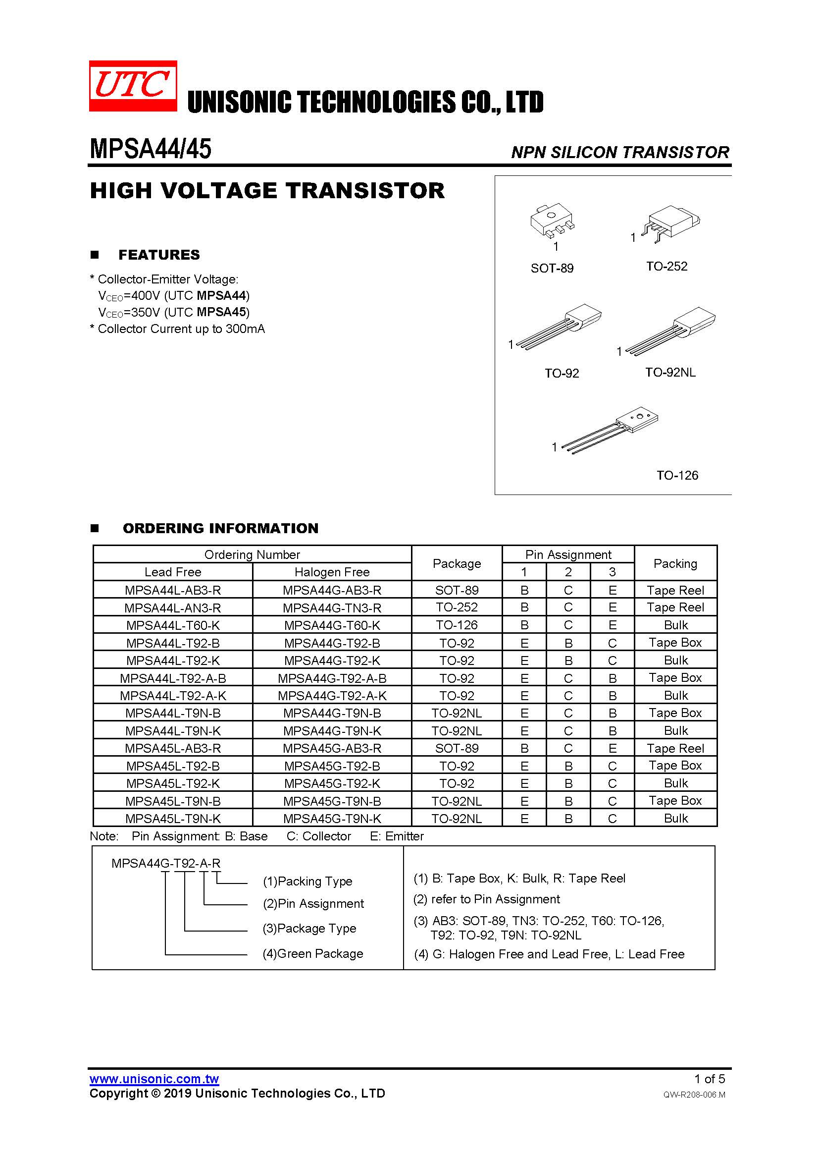 - Collector-Emitter Voltage: VCEO=400V (UTC MPSA44) VCEO=350V (UTC MPSA45)