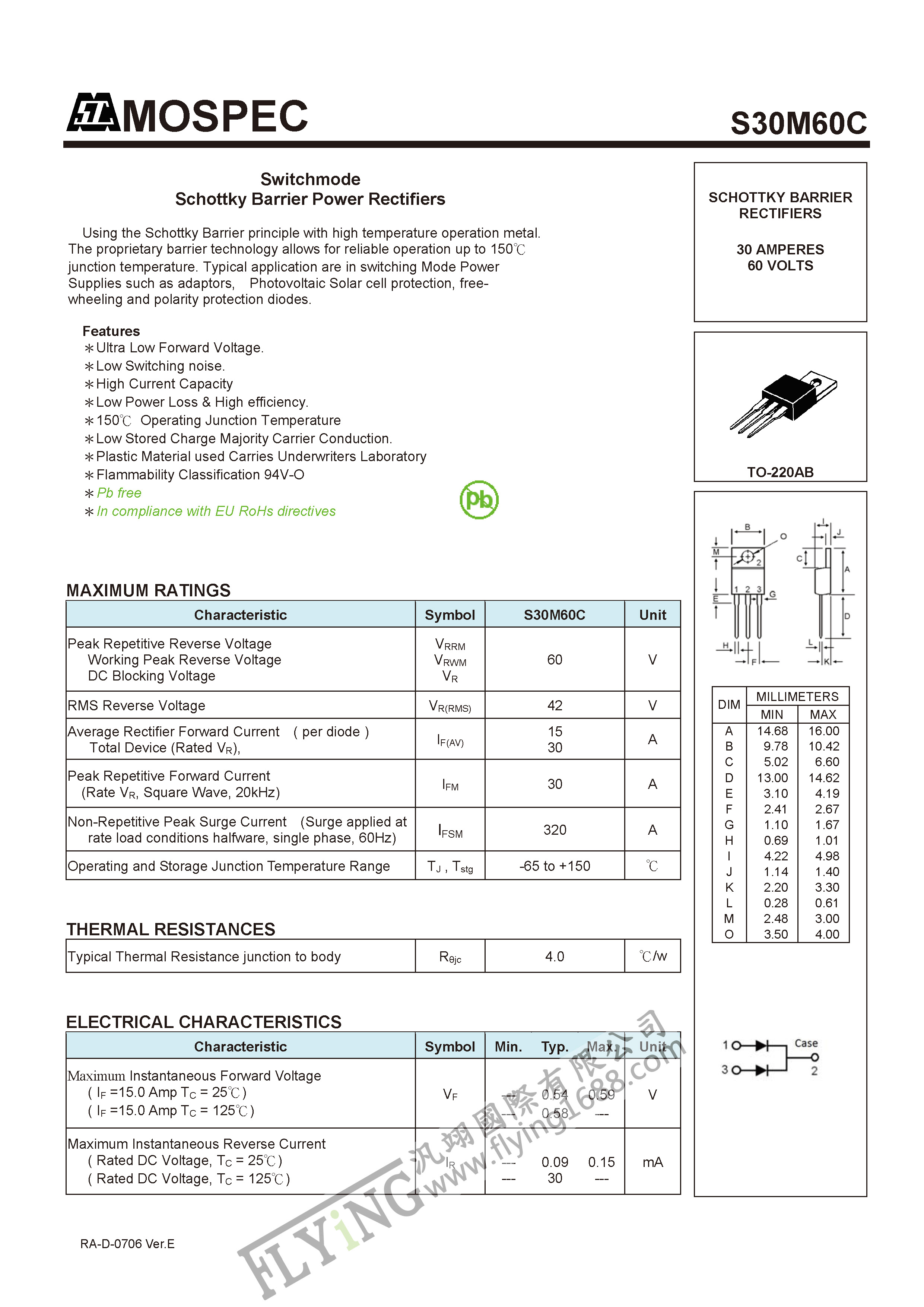 蕭特基二極體 S30M60C 30A 60V TO-220AB MOSPEC