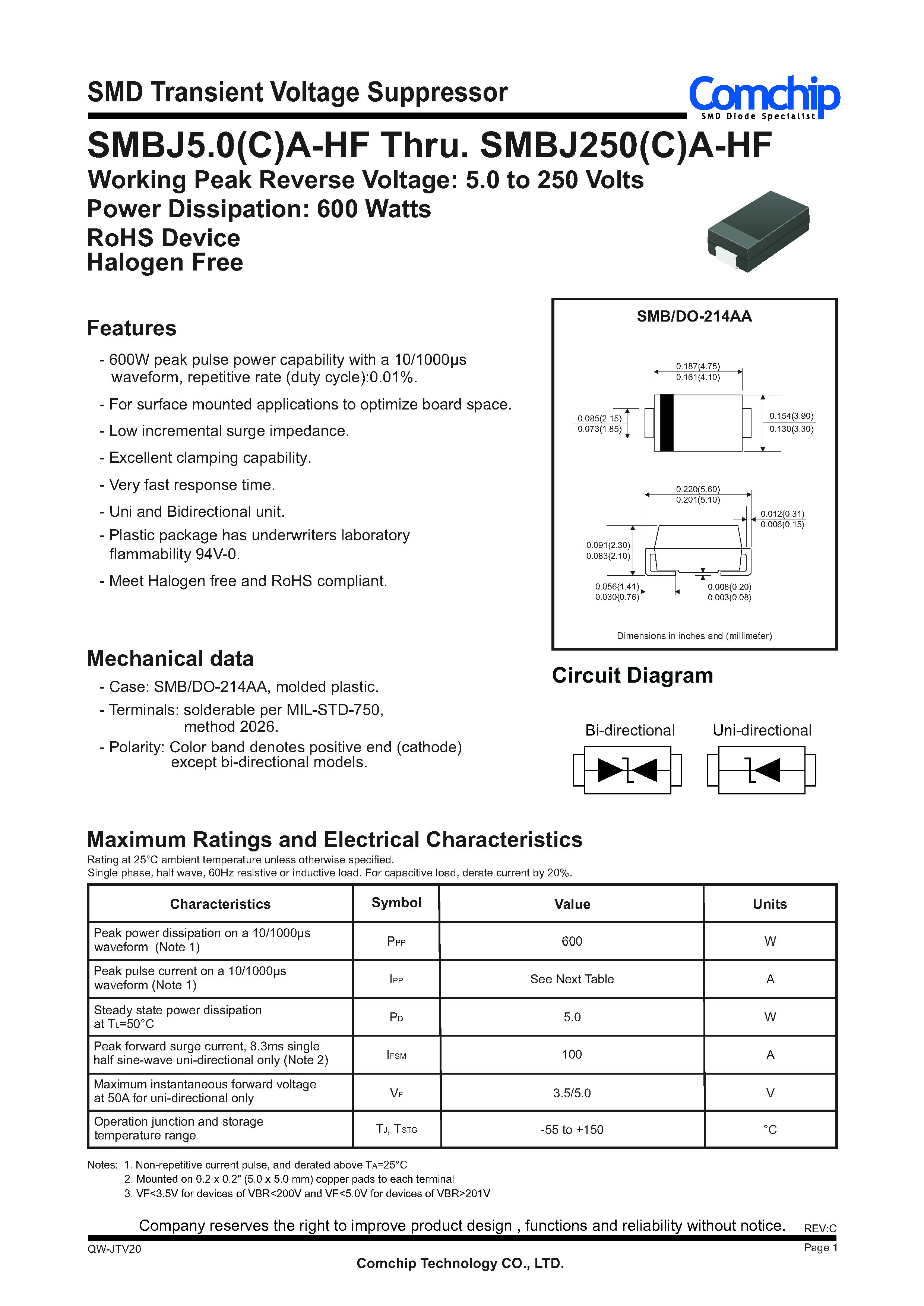 | 說明 | TVS SMBJ20A-HF 600W 20V SMB 單向 Comchip |