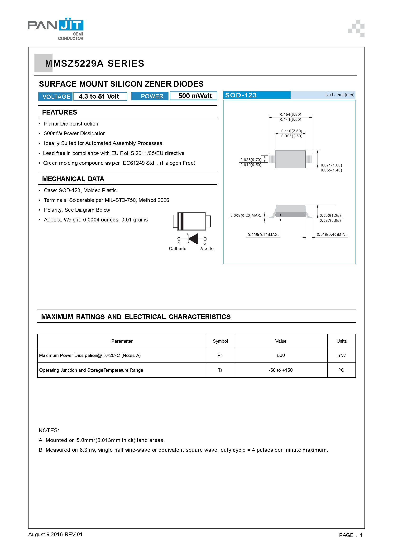 - 外殼:SOD-123,模壓塑料