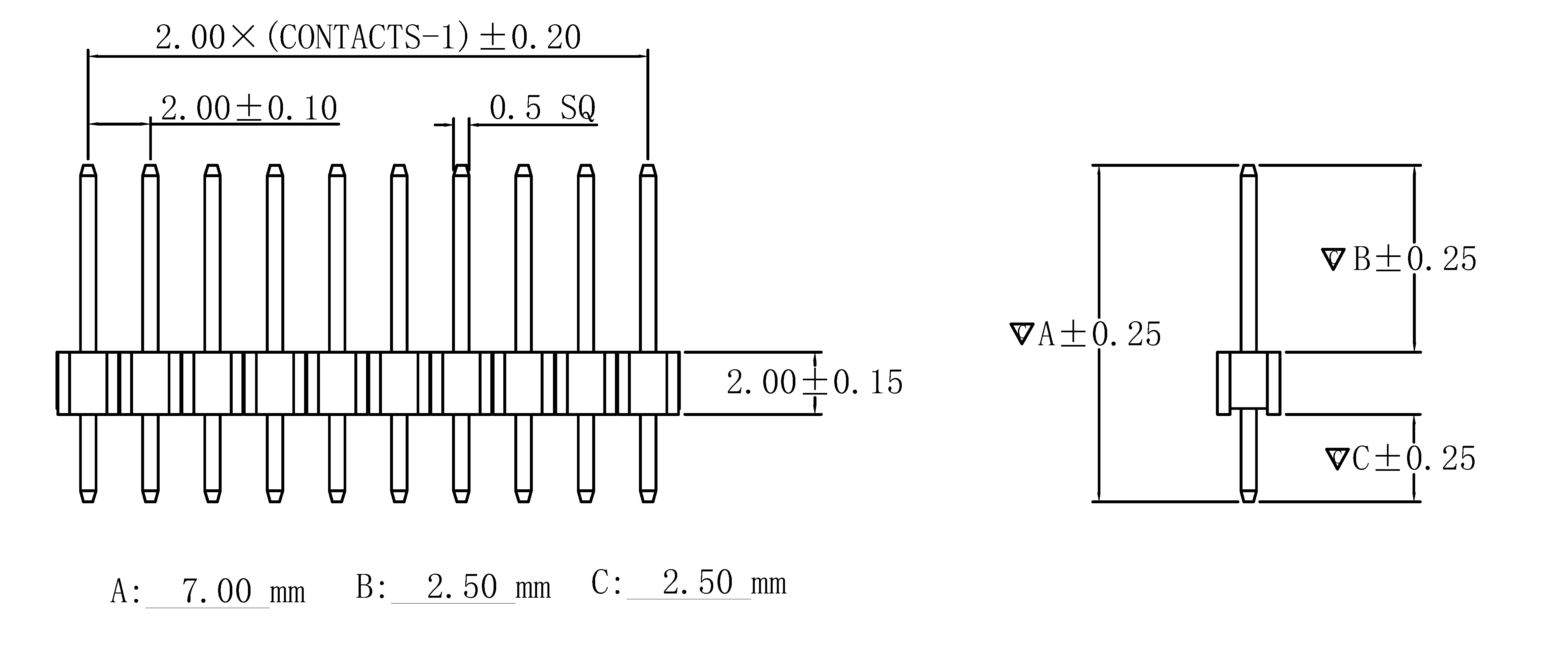 | 尺寸 | 塑高:2.0mm A:7mm B:2.5mm C:6mm |