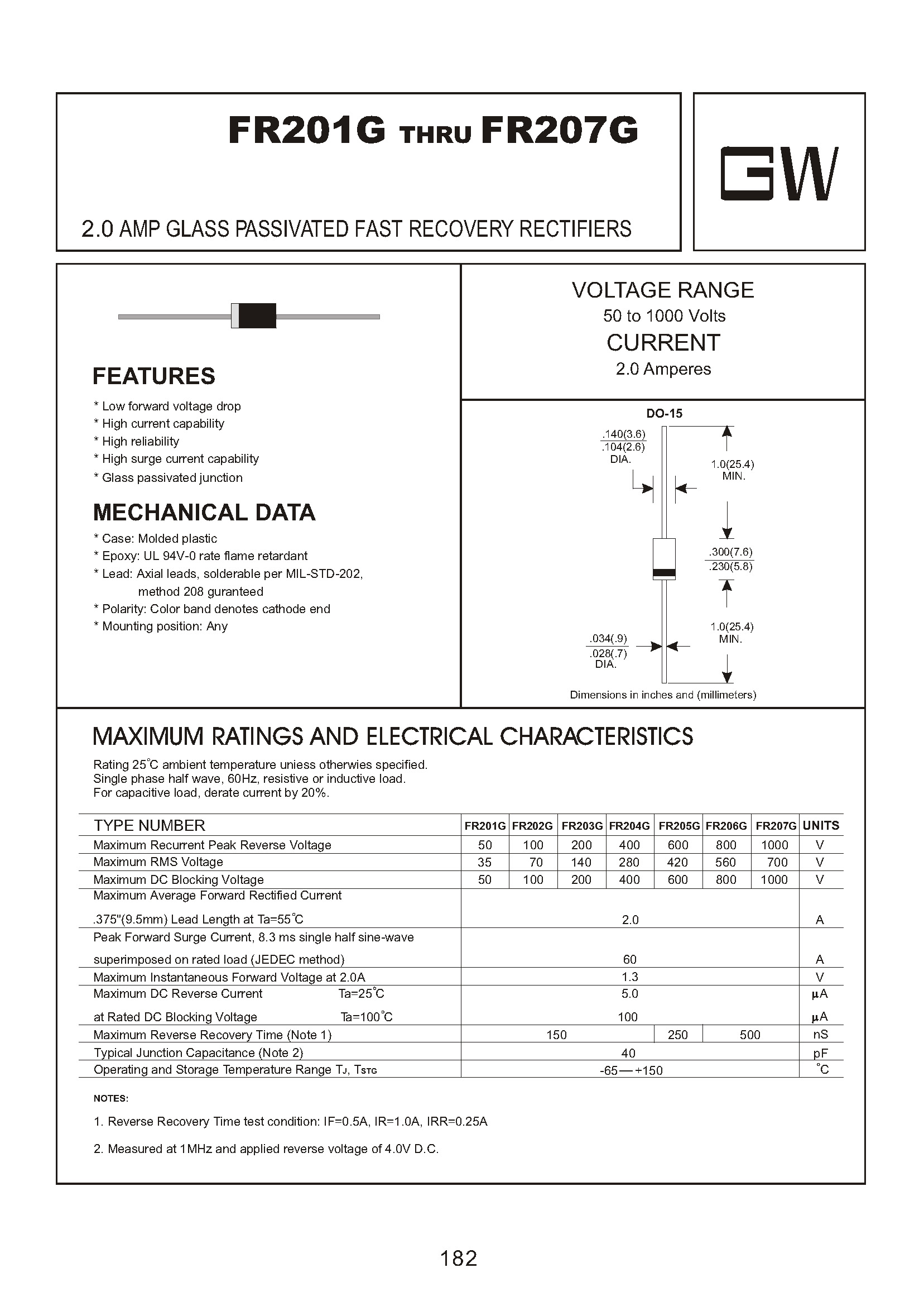 FR201G THRU FR207G 2.0 AMP GLASS PASSIVATED FAST RECOVERY RECTIFIERS