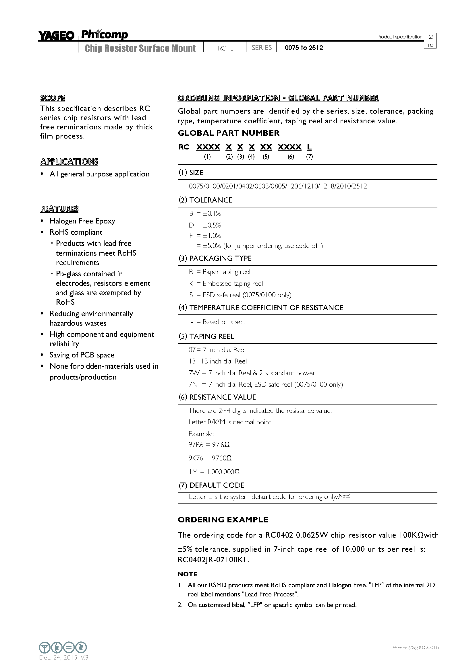 This specification describes RC 0402 series chip resistors with lead-free terminations made by thick film process